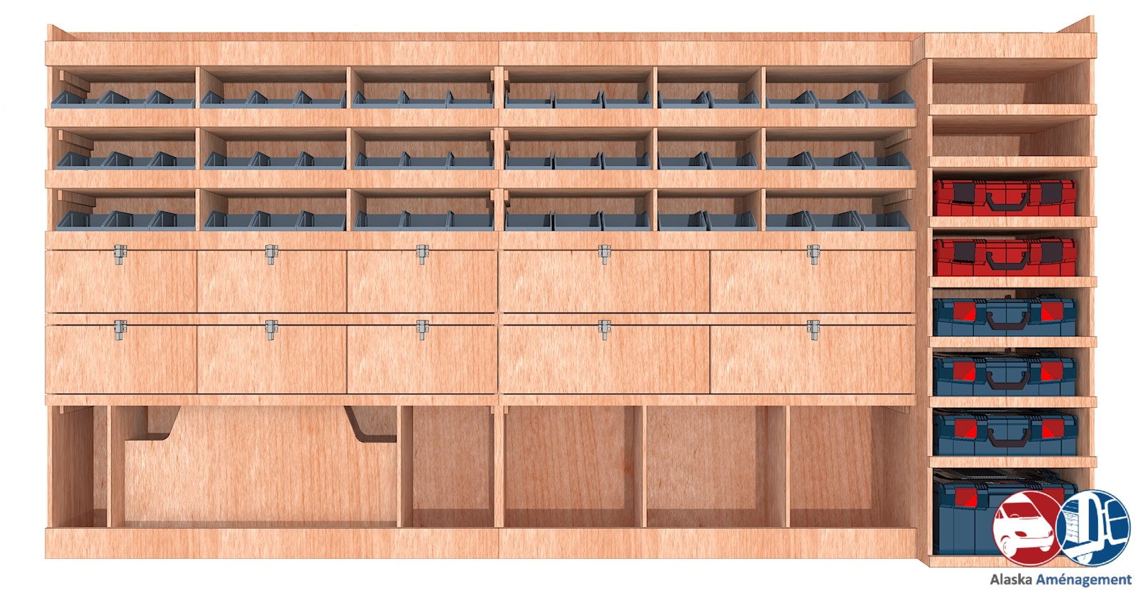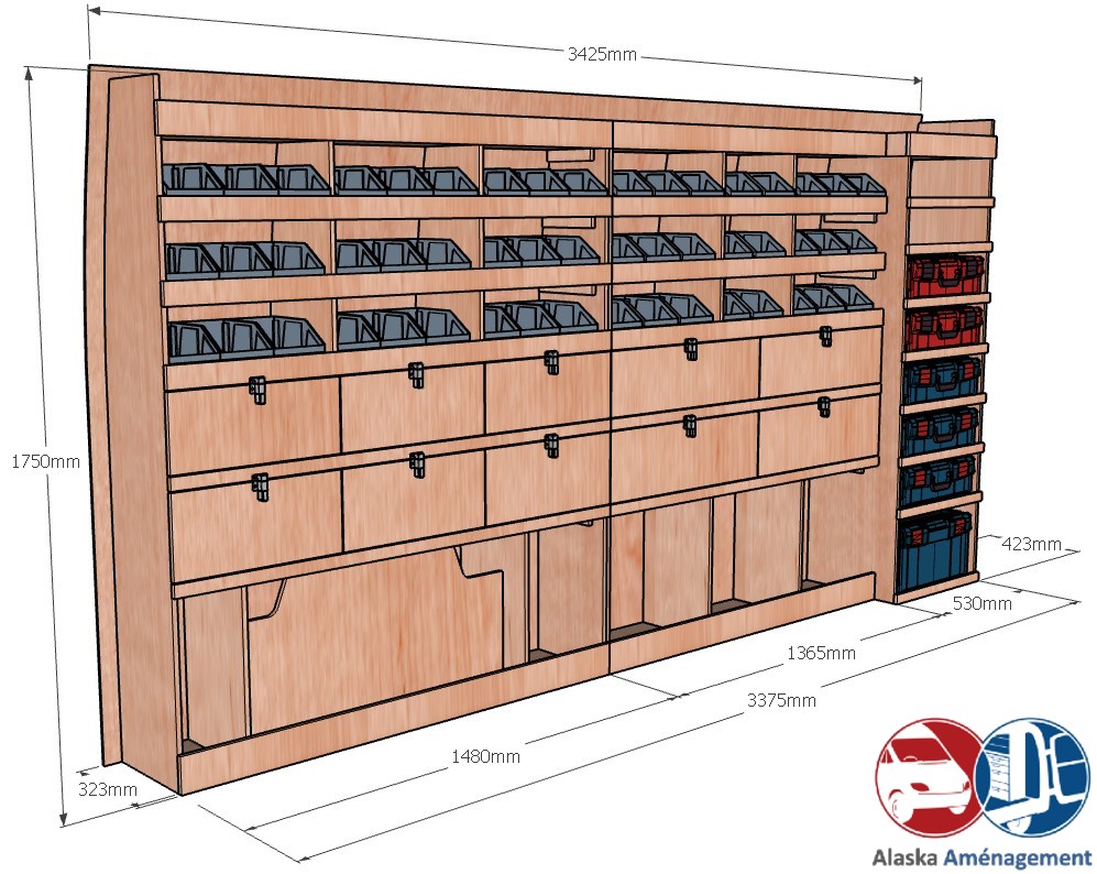 Ce meuble de rangement KRMG002-N (pour le latéral « Gauche » de votre véhicule) offre une solution de stockage polyvalente et fonctionnelle avec sept niveaux de stockage. Il comprend des étagères pour bacs à bec, des clapets basculants, et un module spécifique pour les mallettes d’électroportatif. Une étagère supérieure est conçue pour les objets longs. Son fond arrière intégré assure la rigidité et protège la carrosserie du véhicule, évitant un habillage supplémentaire. Le meuble est disponible en contreplaqué brut ou filmé. |