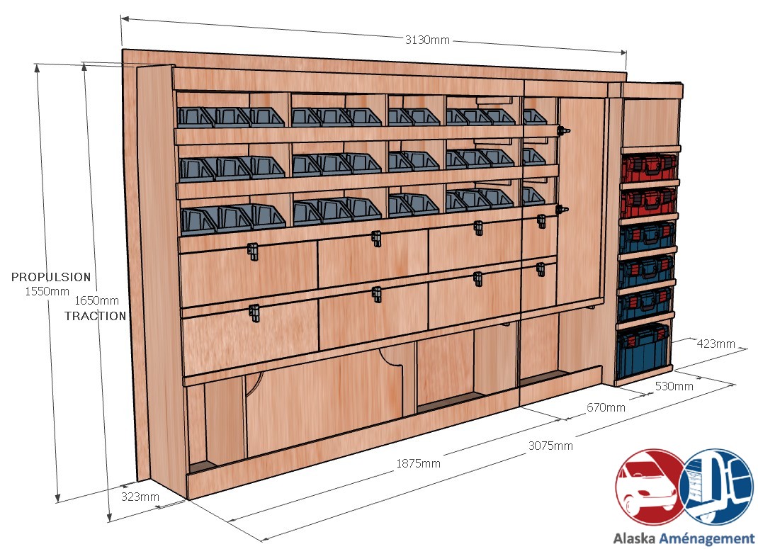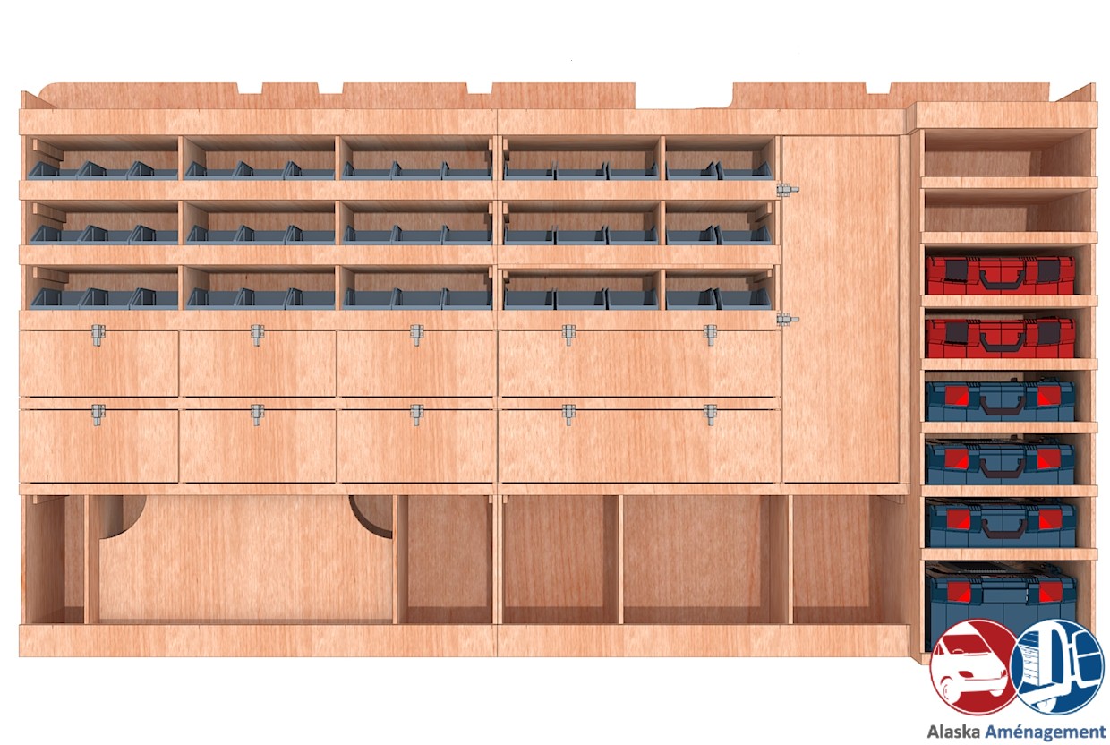 Ce meuble de rangement KRMG003-N (pour le latéral « Gauche » de votre véhicule) offre une solution polyvalente avec sept niveaux de stockage fonctionnels. Il comprend des étagères pour bacs à bec, des clapets basculants, un placard et un module spécifique pour les mallettes d’électroportatif. Une étagère supérieure est conçue pour les objets longs. Son fond arrière intégré assure la rigidité et protège la carrosserie du véhicule, évitant un habillage supplémentaire. Le meuble est disponible en contreplaqué brut ou filmé. |