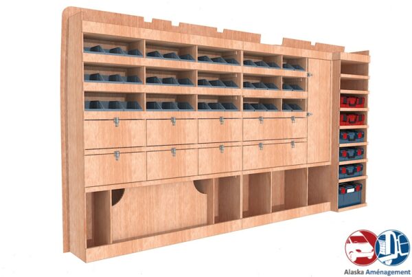 Ce meuble de rangement KRMG003-N(pour le latéral « Gauche » de votre véhicule) offre une solution polyvalente avec sept niveaux de stockage fonctionnels. Il comprend des étagères pour bacs à bec, des clapets basculants, un placard et un module spécifique pour les mallettes d’électroportatif. Une étagère supérieure est conçue pour les objets longs. Son fond arrière intégré assure la rigidité et protège la carrosserie du véhicule, évitant un habillage supplémentaire. Le meuble est disponible en contreplaqué brut ou filmé.