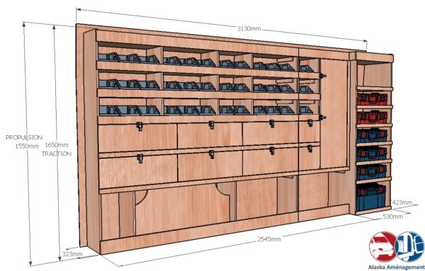 Structure Renforcée et Protectrice : Le meuble intègre un fond arrière de 8 mm qui renforce sa structure et le solidarise. Un avantage économique direct pour vous : il protège efficacement la carrosserie de votre fourgon, vous dispensant d’installer un habillage latéral supplémentaire !