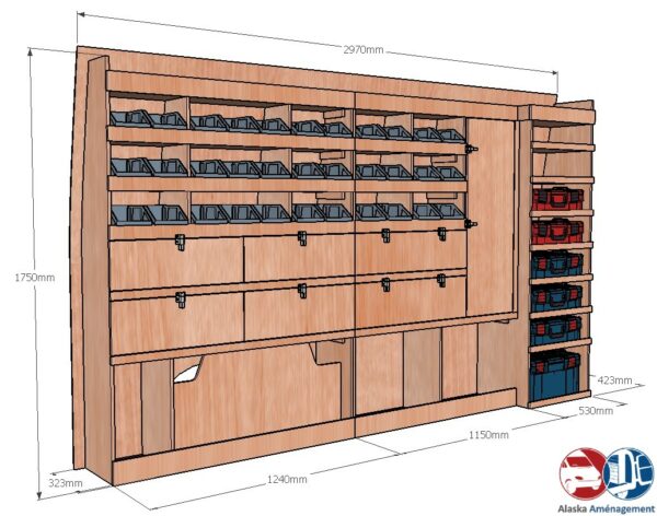 Ce meuble de rangement KRMG003-N(pour le latéral « Gauche » de votre véhicule) offre une solution polyvalente avec sept niveaux de stockage fonctionnels. Il comprend des étagères pour bacs à bec, des clapets basculants, un placard et un module spécifique pour les mallettes d’électroportatif. Une étagère supérieure est conçue pour les objets longs. Son fond arrière intégré assure la rigidité et protège la carrosserie du véhicule, évitant un habillage supplémentaire. Le meuble est disponible en contreplaqué brut ou filmé.