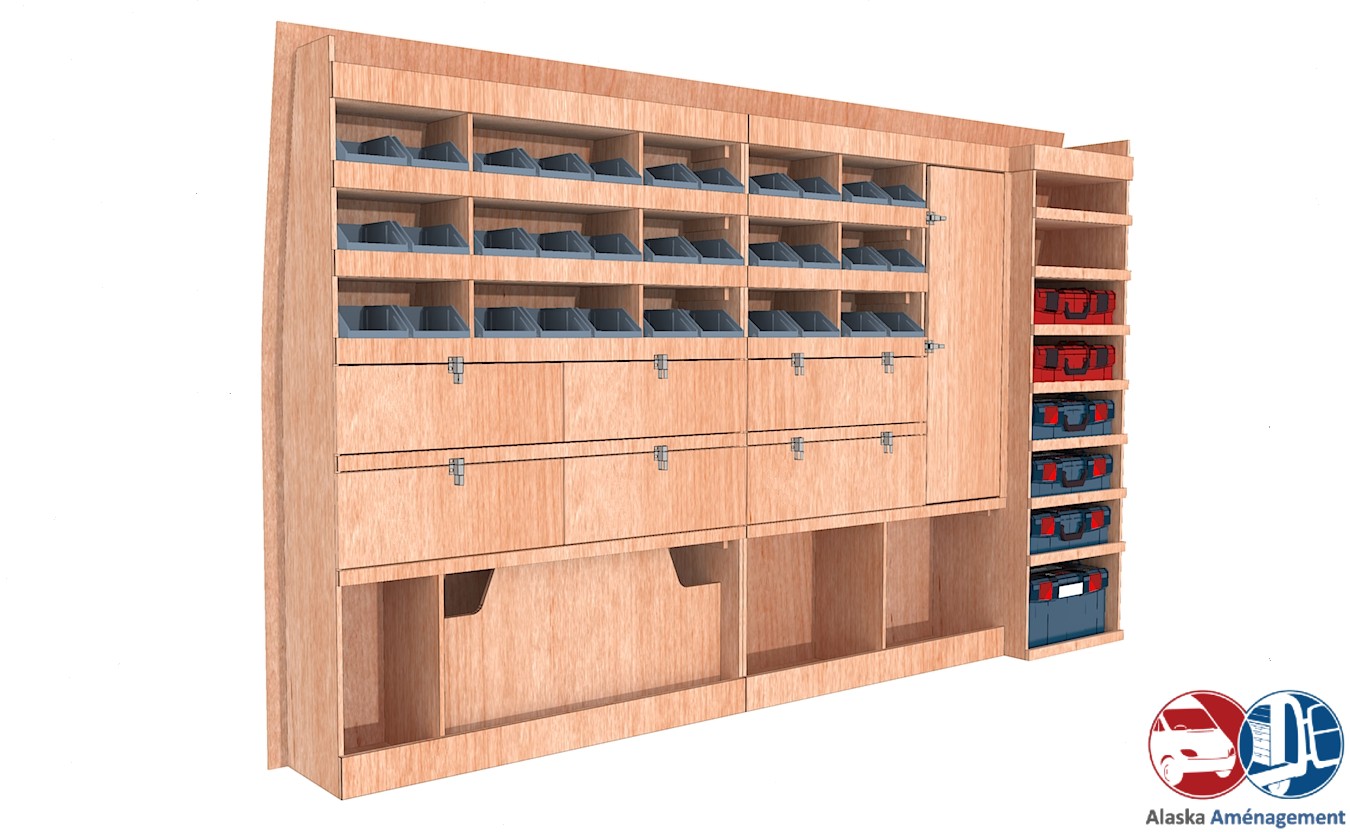 Ce meuble de rangement KRMG003-N(pour le latéral « Gauche » de votre véhicule) offre une solution polyvalente avec sept niveaux de stockage fonctionnels. Il comprend des étagères pour bacs à bec, des clapets basculants, un placard et un module spécifique pour les mallettes d’électroportatif. Une étagère supérieure est conçue pour les objets longs. Son fond arrière intégré assure la rigidité et protège la carrosserie du véhicule, évitant un habillage supplémentaire. Le meuble est disponible en contreplaqué brut ou filmé.