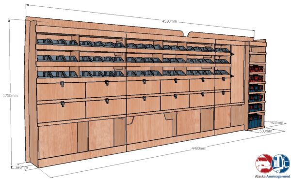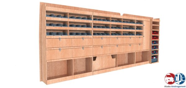 Ce meuble de rangement KRMG003-N(pour le latéral « Gauche » de votre véhicule) offre une solution polyvalente avec sept niveaux de stockage fonctionnels. Il comprend des étagères pour bacs à bec, des clapets basculants, un placard et un module spécifique pour les mallettes d’électroportatif. Une étagère supérieure est conçue pour les objets longs. Son fond arrière intégré assure la rigidité et protège la carrosserie du véhicule, évitant un habillage supplémentaire. Le meuble est disponible en contreplaqué brut ou filmé.