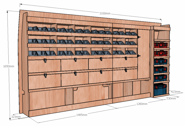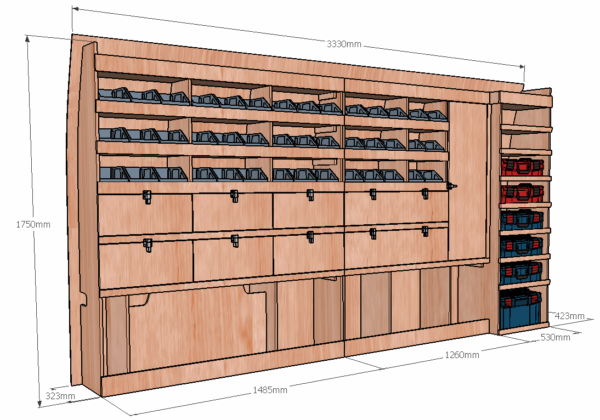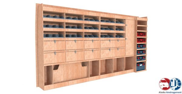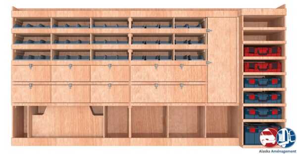 Ce meuble de rangement KRMG003-N(pour le latéral « Gauche » de votre véhicule) offre une solution polyvalente avec sept niveaux de stockage fonctionnels. Il comprend des étagères pour bacs à bec, des clapets basculants, un placard et un module spécifique pour les mallettes d’électroportatif. Une étagère supérieure est conçue pour les objets longs. Son fond arrière intégré assure la rigidité et protège la carrosserie du véhicule, évitant un habillage supplémentaire. Le meuble est disponible en contreplaqué brut ou filmé.
