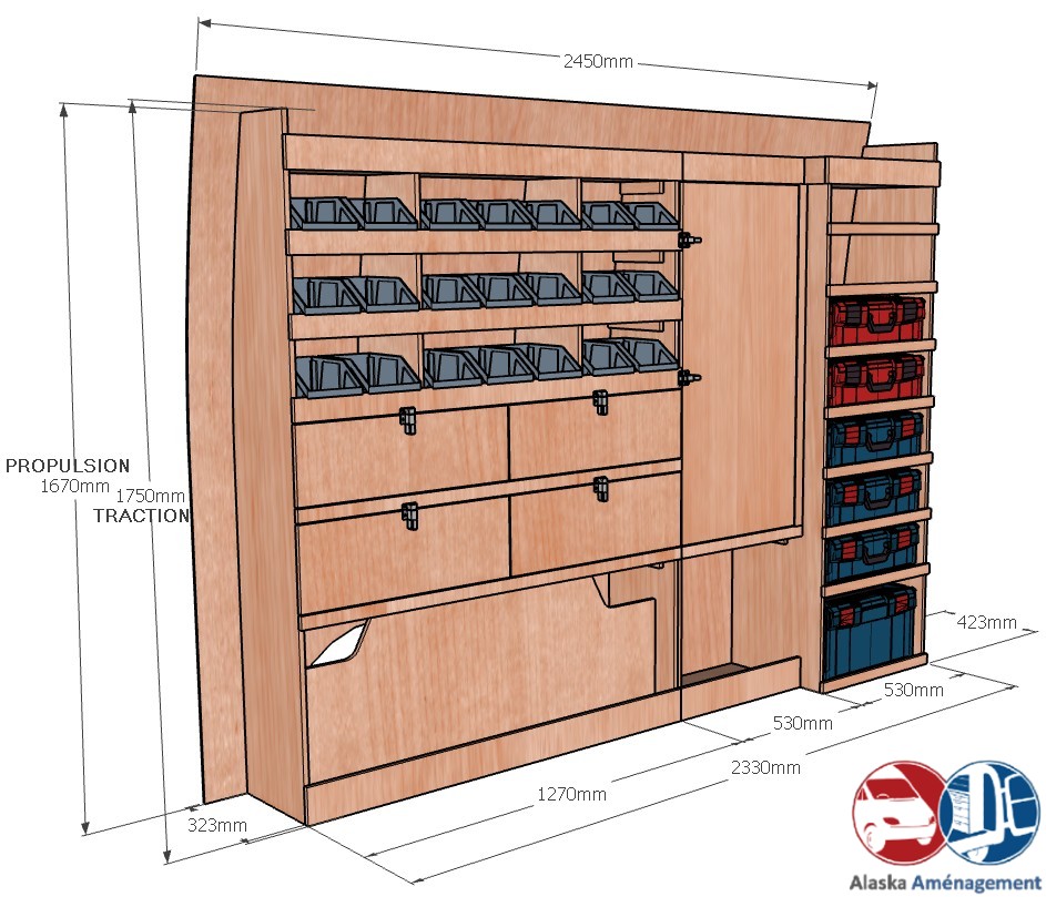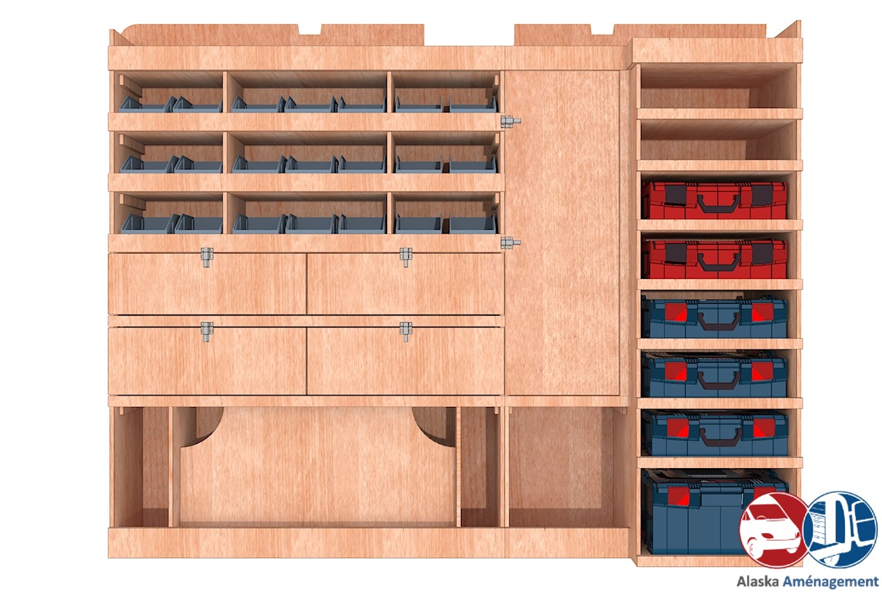 Ce meuble de rangement KRMG003-N (pour le latéral « Gauche » de votre véhicule) offre une solution polyvalente avec six niveaux de stockage fonctionnels. Il comprend des étagères pour bacs à bec, des clapets basculants, un placard et un module spécifique pour les mallettes d’électroportatif. Une étagère supérieure est conçue pour les objets longs. Son fond arrière intégré assure la rigidité et protège la carrosserie du véhicule, évitant un habillage supplémentaire. Le meuble est disponible en contreplaqué brut ou filmé. |