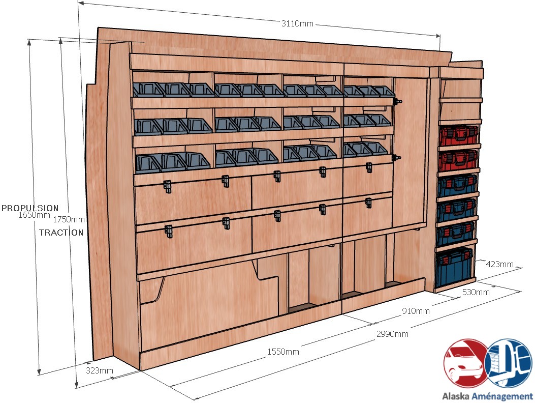 Ce meuble de rangement KRMG003-N (pour le latéral « Gauche » de votre véhicule) offre une solution polyvalente avec sept niveaux de stockage fonctionnels. Il comprend des étagères pour bacs à bec, des clapets basculants, un placard et un module spécifique pour les mallettes d’électroportatif. Une étagère supérieure est conçue pour les objets longs. Son fond arrière intégré assure la rigidité et protège la carrosserie du véhicule, évitant un habillage supplémentaire. Le meuble est disponible en contreplaqué brut ou filmé. |