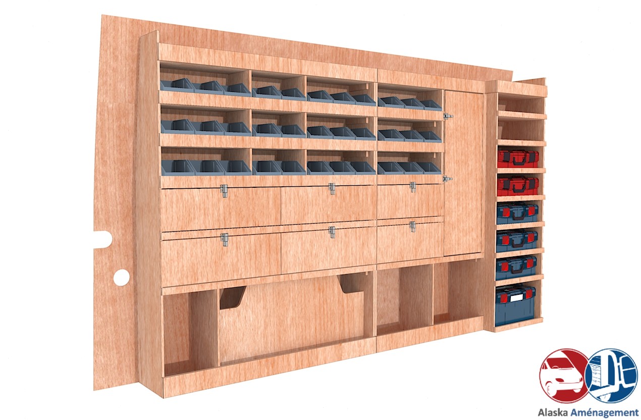Ce meuble de rangement KRMG003-N(pour le latéral « Gauche » de votre véhicule) offre une solution polyvalente avec sept niveaux de stockage fonctionnels. Il comprend des étagères pour bacs à bec, des clapets basculants, un placard et un module spécifique pour les mallettes d’électroportatif. Une étagère supérieure est conçue pour les objets longs. Son fond arrière intégré assure la rigidité et protège la carrosserie du véhicule, évitant un habillage supplémentaire. Le meuble est disponible en contreplaqué brut ou filmé.