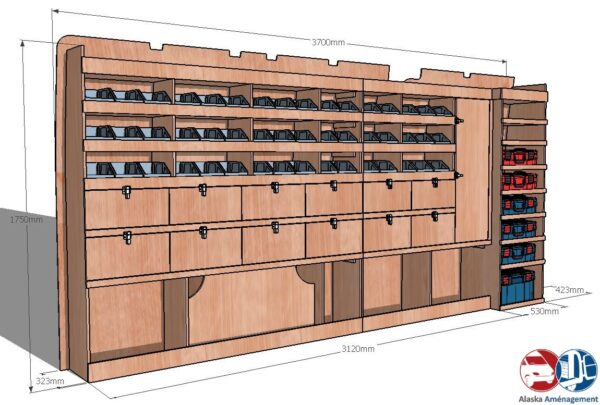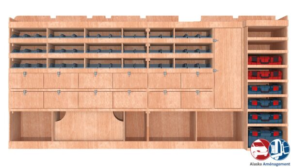 Ce meuble de rangement KRMG003-N(pour le latéral « Gauche » de votre véhicule) offre une solution polyvalente avec sept niveaux de stockage fonctionnels. Il comprend des étagères pour bacs à bec, des clapets basculants, un placard et un module spécifique pour les mallettes d’électroportatif. Une étagère supérieure est conçue pour les objets longs. Son fond arrière intégré assure la rigidité et protège la carrosserie du véhicule, évitant un habillage supplémentaire. Le meuble est disponible en contreplaqué brut ou filmé.
