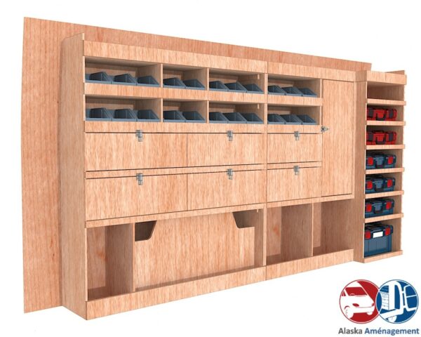 Ce meuble de rangement KRMG003-N (pour le latéral « Gauche » de votre véhicule) offre une solution polyvalente avec six niveaux de stockage fonctionnels. Il comprend des étagères pour bacs à bec, des clapets basculants, un placard et un module spécifique pour les mallettes d’électroportatif. Une étagère supérieure est conçue pour les objets longs. Son fond arrière intégré assure la rigidité et protège la carrosserie du véhicule, évitant un habillage supplémentaire. Le meuble est disponible en contreplaqué brut ou filmé.