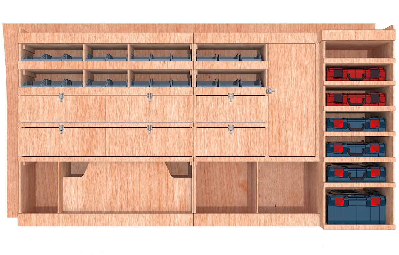 • Module pour Électroportatif : Un module vertical dédié au rangement de vos mallettes d’outils (type Festool Systainer, Makita, Facom etc.). Des rebords de maintien assurent une stabilité parfaite pendant le transport.