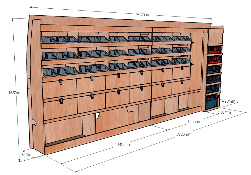 Ce meuble de rangement KRMG003-N (pour le latéral « Gauche » de votre véhicule) offre une solution polyvalente avec sept niveaux de stockage fonctionnels. Il comprend des étagères pour bacs à bec, des clapets basculants, un placard et un module spécifique pour les mallettes d’électroportatif. Une étagère supérieure est conçue pour les objets longs. Son fond arrière intégré assure la rigidité et protège la carrosserie du véhicule, évitant un habillage supplémentaire. Le meuble est disponible en contreplaqué brut ou filmé.