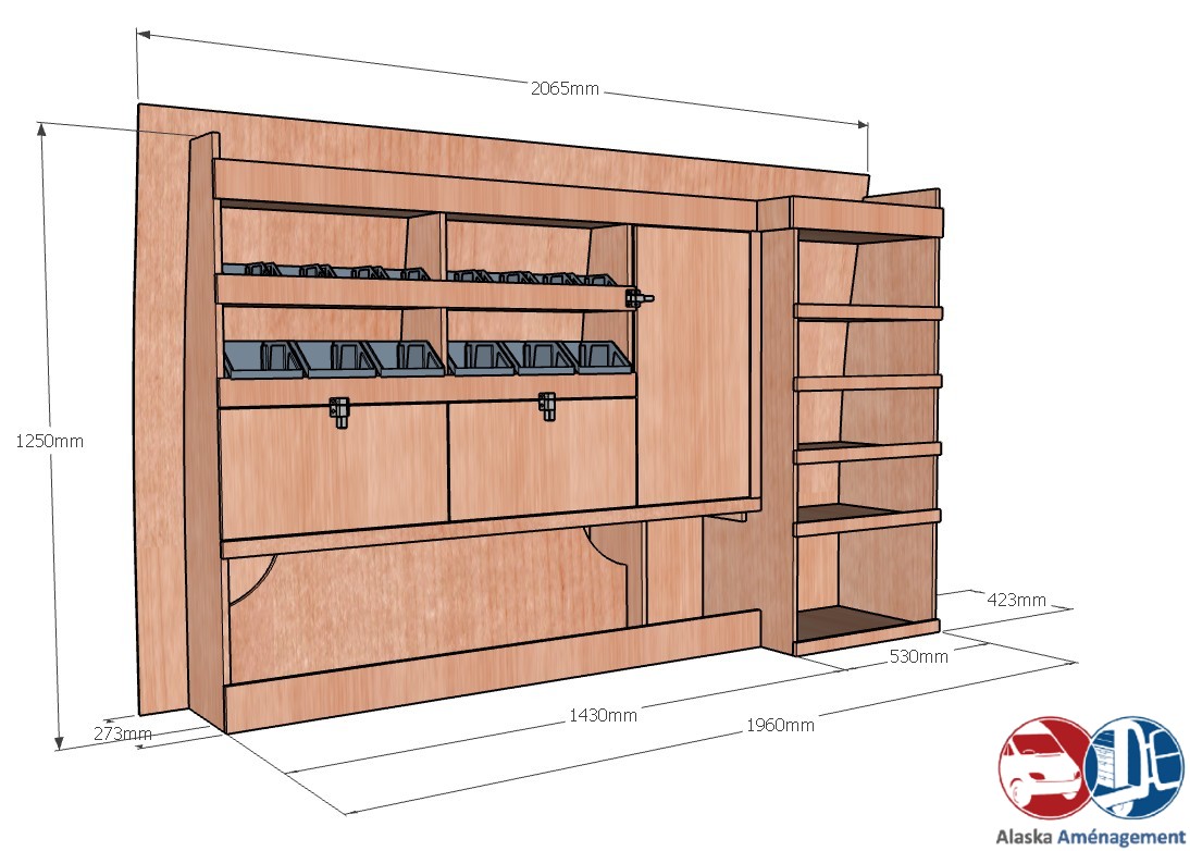 Ce meuble de rangement KRMG003-N (pour le latéral « Gauche » de votre véhicule) offre une solution polyvalente avec cinq niveaux de stockage fonctionnels. Il comprend des étagères pour bacs à bec, des clapets basculants, un placard et un module spécifique pour les mallettes d’électroportatif. Une étagère supérieure est conçue pour les objets longs. Son fond arrière intégré assure la rigidité et protège la carrosserie du véhicule, évitant un habillage supplémentaire. Le meuble est disponible en contreplaqué brut ou filmé. |