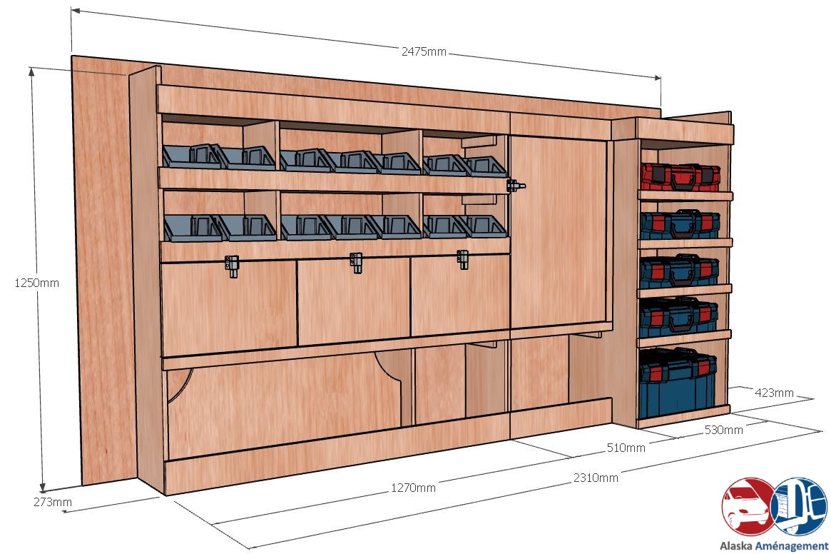 Solution complète avec placard, clapets et rangement pour mallettes d’électroportatifs, pensée pour les professionnels exigeants.