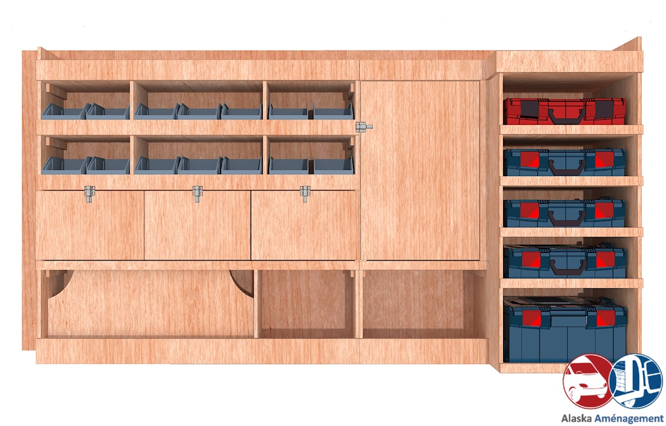 Ce meuble de rangement KRMG003-N (pour le latéral « Gauche » de votre véhicule) offre une solution polyvalente avec cinq niveaux de stockage fonctionnels. Il comprend des étagères pour bacs à bec, des clapets basculants, un placard et un module spécifique pour les mallettes d’électroportatif. Une étagère supérieure est conçue pour les objets longs. Son fond arrière intégré assure la rigidité et protège la carrosserie du véhicule, évitant un habillage supplémentaire. Le meuble est disponible en contreplaqué brut ou filmé.