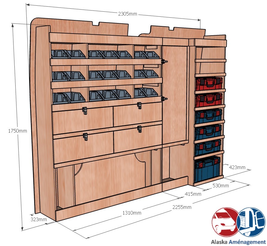 Ce meuble de rangement KRMG003-N (pour le latéral « Gauche » de votre véhicule) offre une solution polyvalente avec six niveaux de stockage fonctionnels. Il comprend des étagères pour bacs à bec, des clapets basculants, un placard et un module spécifique pour les mallettes d’électroportatif. Une étagère supérieure est conçue pour les objets longs. Son fond arrière intégré assure la rigidité et protège la carrosserie du véhicule, évitant un habillage supplémentaire. Le meuble est disponible en contreplaqué brut ou filmé.