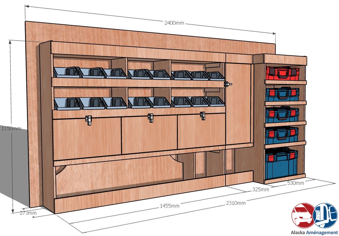 Ce meuble de rangement KRMG003-N (pour le latéral « Gauche » de votre véhicule) offre une solution polyvalente avec cinq niveaux de stockage fonctionnels. Il comprend des étagères pour bacs à bec, des clapets basculants, un placard et un module spécifique pour les mallettes d’électroportatif. Une étagère supérieure est conçue pour les objets longs. Son fond arrière intégré assure la rigidité et protège la carrosserie du véhicule, évitant un habillage supplémentaire. Le meuble est disponible en contreplaqué brut ou filmé. |