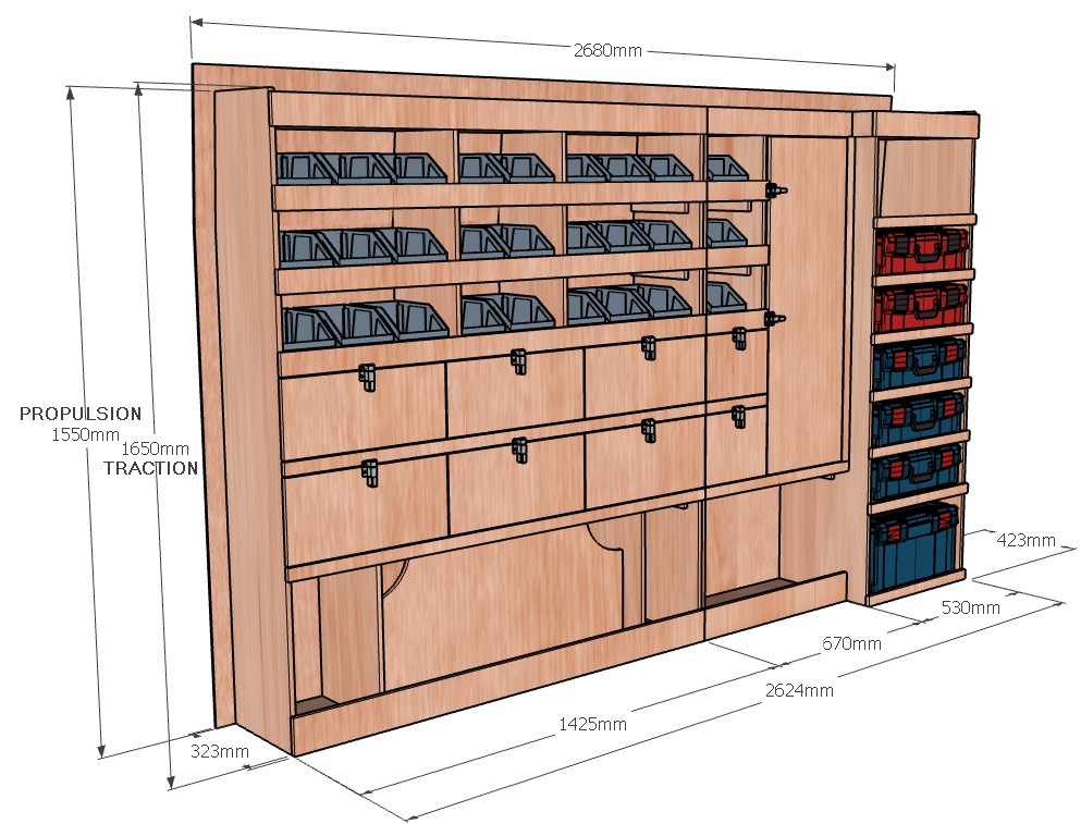 • Module pour Électroportatif : Un module vertical dédié au rangement de vos mallettes d’outils (type Festool Systainer, Makita, Facom etc.). Des rebords de maintien assurent une stabilité parfaite pendant le transport.