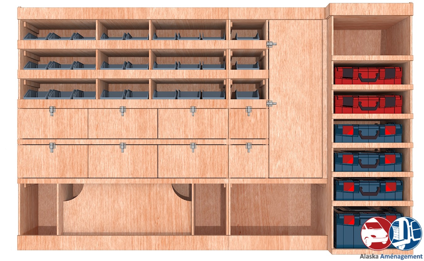 Ce meuble de rangement KRMG003-N (pour le latéral « Gauche » de votre véhicule) offre une solution polyvalente avec sept niveaux de stockage fonctionnels. Il comprend des étagères pour bacs à bec, des clapets basculants, un placard et un module spécifique pour les mallettes d’électroportatif. Une étagère supérieure est conçue pour les objets longs. Son fond arrière intégré assure la rigidité et protège la carrosserie du véhicule, évitant un habillage supplémentaire. Le meuble est disponible en contreplaqué brut ou filmé.