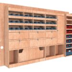 Solution complète avec placard, clapets et rangement pour mallettes d’électroportatifs, pensée pour les professionnels exigeants.