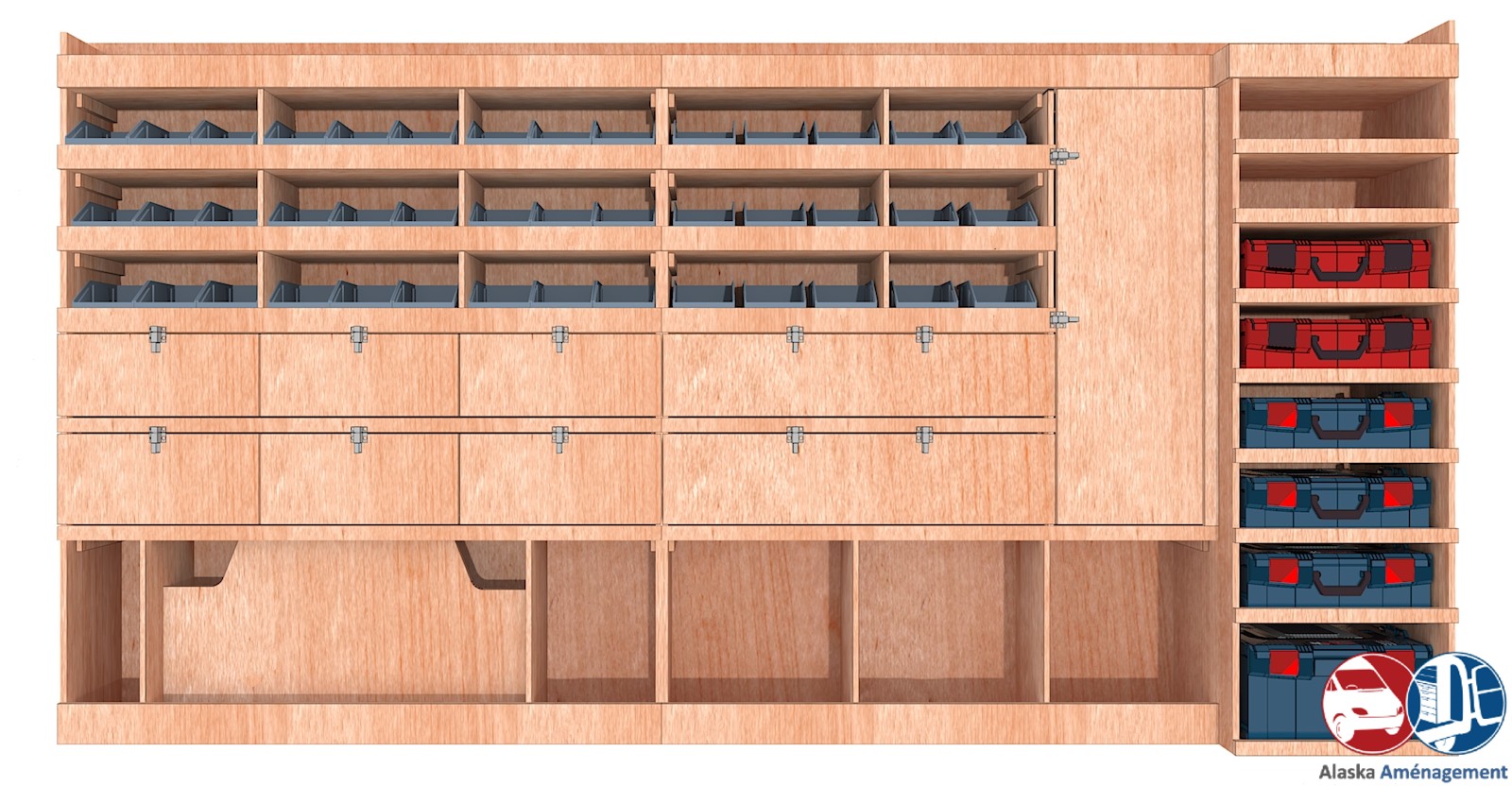 Ce meuble de rangement KRMG003-N (pour le latéral « Gauche » de votre véhicule) offre une solution polyvalente avec sept niveaux de stockage fonctionnels. Il comprend des étagères pour bacs à bec, des clapets basculants, un placard et un module spécifique pour les mallettes d’électroportatif. Une étagère supérieure est conçue pour les objets longs. Son fond arrière intégré assure la rigidité et protège la carrosserie du véhicule, évitant un habillage supplémentaire. Le meuble est disponible en contreplaqué brut ou filmé.
