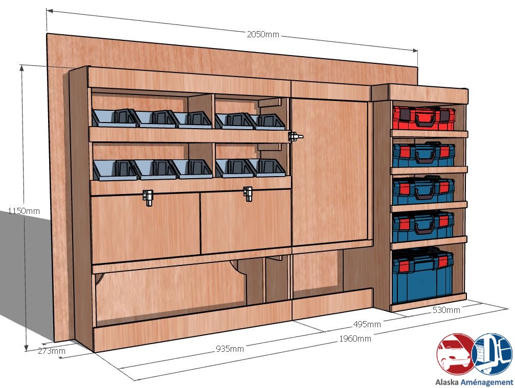 Ce meuble de rangement KRMG003-N (pour le latéral « Gauche » de votre véhicule) offre une solution polyvalente avec cinq niveaux de stockage fonctionnels. Il comprend des étagères pour bacs à bec, des clapets basculants, un placard et un module spécifique pour les mallettes d’électroportatif. Une étagère supérieure est conçue pour les objets longs. Son fond arrière intégré assure la rigidité et protège la carrosserie du véhicule, évitant un habillage supplémentaire. Le meuble est disponible en contreplaqué brut ou filmé. |