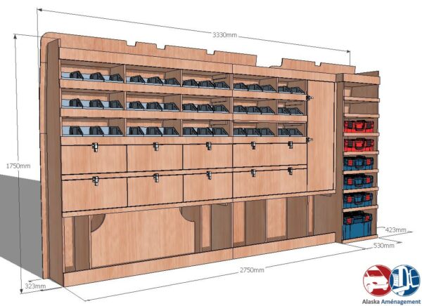 Ce meuble de rangement KRMG003-N(pour le latéral « Gauche » de votre véhicule) offre une solution polyvalente avec sept niveaux de stockage fonctionnels. Il comprend des étagères pour bacs à bec, des clapets basculants, un placard et un module spécifique pour les mallettes d’électroportatif. Une étagère supérieure est conçue pour les objets longs. Son fond arrière intégré assure la rigidité et protège la carrosserie du véhicule, évitant un habillage supplémentaire. Le meuble est disponible en contreplaqué brut ou filmé.