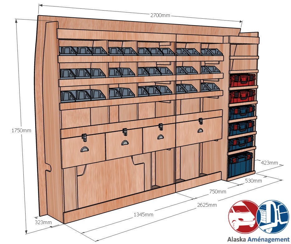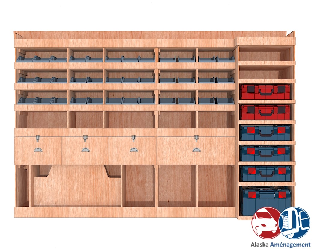 Ce meuble de rangement KRMG004-N (pour le latéral « Gauche » de votre véhicule) offre une solution polyvalente et fonctionnelle avec sept niveaux de stockage. Il comprend des étagères pour bacs à bec, une rangée de tiroirs et un module spécifique pour les mallettes d’électroportatif. Une étagère supérieure est conçue pour les objets longs. Son fond arrière intégré assure la rigidité et protège la carrosserie du véhicule, évitant un habillage supplémentaire. Le meuble est disponible en contreplaqué brut ou filmé. |