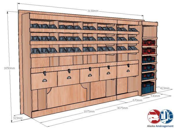 Ce meuble de rangement KRMG004-N(pour le latéral « Gauche » de votre véhicule) offre une solution polyvalente et fonctionnelle avec sept niveaux de stockage. Il comprend des étagères pour bacs à bec, une rangée de tiroirs et un module spécifique pour les mallettes d’électroportatif. Une étagère supérieure est conçue pour les objets longs. Son fond arrière intégré assure la rigidité et protège la carrosserie du véhicule, évitant un habillage supplémentaire. Le meuble est disponible en contreplaqué brut ou filmé.