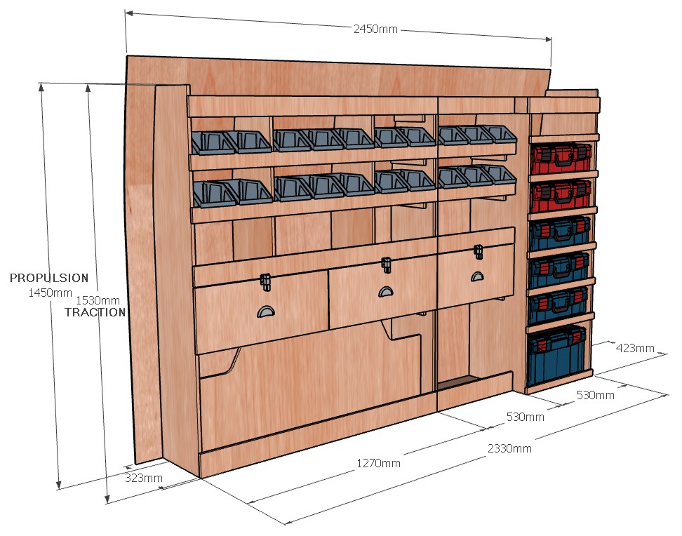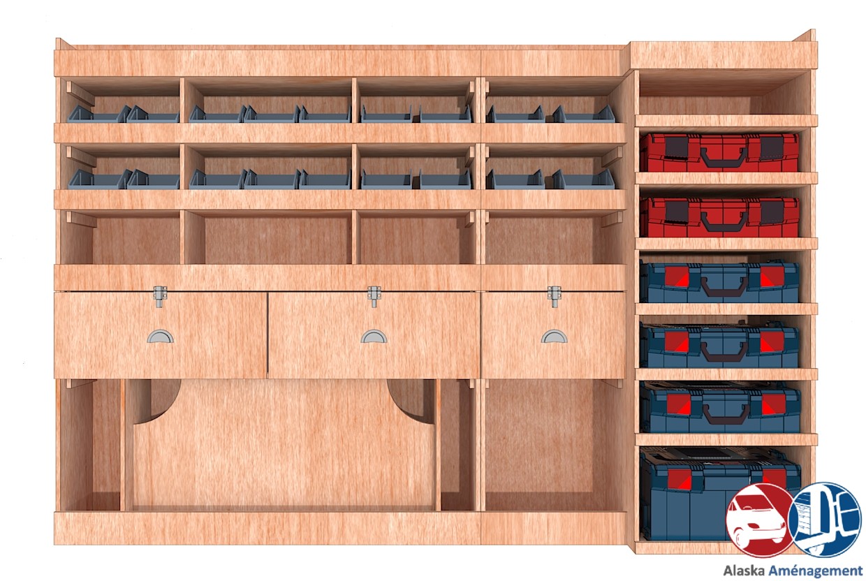 Ce meuble de rangement KRMG004-N (pour le latéral « Gauche » de votre véhicule) offre une solution polyvalente et fonctionnelle avec six niveaux de stockage. Il comprend des étagères pour bacs à bec, une rangée de tiroirs et un module spécifique pour les mallettes d’électroportatif. Une étagère supérieure est conçue pour les objets longs. Son fond arrière intégré assure la rigidité et protège la carrosserie du véhicule, évitant un habillage supplémentaire. Le meuble est disponible en contreplaqué brut ou filmé.