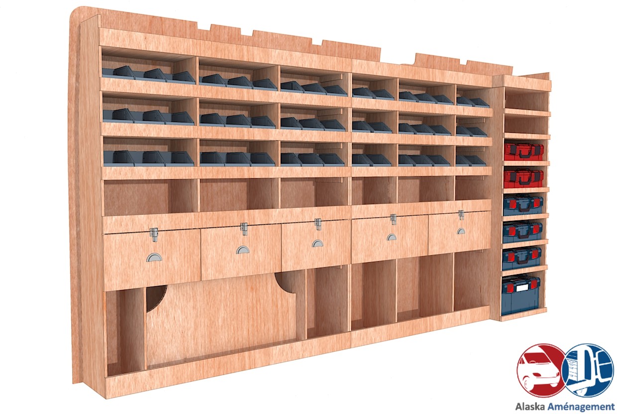 Ce meuble de rangement KRMG004-N(pour le latéral « Gauche » de votre véhicule) offre une solution polyvalente et fonctionnelle avec sept niveaux de stockage. Il comprend des étagères pour bacs à bec, une rangée de tiroirs et un module spécifique pour les mallettes d’électroportatif. Une étagère supérieure est conçue pour les objets longs. Son fond arrière intégré assure la rigidité et protège la carrosserie du véhicule, évitant un habillage supplémentaire. Le meuble est disponible en contreplaqué brut ou filmé.