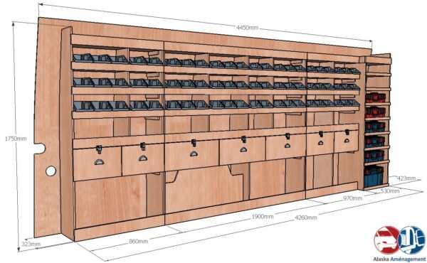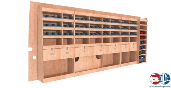 Ce meuble de rangement KRMG004-N(pour le latéral « Gauche » de votre véhicule) offre une solution polyvalente et fonctionnelle avec sept niveaux de stockage. Il comprend des étagères pour bacs à bec, une rangée de tiroirs et un module spécifique pour les mallettes d’électroportatif. Une étagère supérieure est conçue pour les objets longs. Son fond arrière intégré assure la rigidité et protège la carrosserie du véhicule, évitant un habillage supplémentaire. Le meuble est disponible en contreplaqué brut ou filmé.