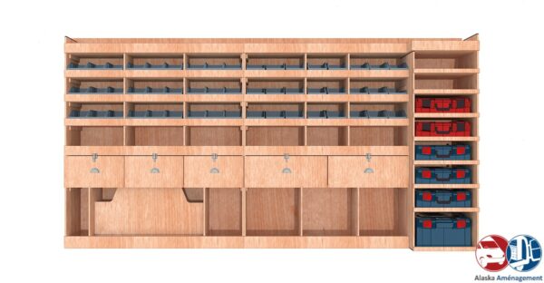 Ce meuble de rangement KRMG004-N(pour le latéral « Gauche » de votre véhicule) offre une solution polyvalente et fonctionnelle avec sept niveaux de stockage. Il comprend des étagères pour bacs à bec, une rangée de tiroirs et un module spécifique pour les mallettes d’électroportatif. Une étagère supérieure est conçue pour les objets longs. Son fond arrière intégré assure la rigidité et protège la carrosserie du véhicule, évitant un habillage supplémentaire. Le meuble est disponible en contreplaqué brut ou filmé.