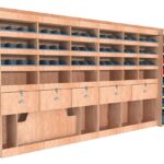 Ce meuble de rangement KRMG004-N (pour le latéral « Gauche » de votre véhicule) offre une solution polyvalente et fonctionnelle avec sept niveaux de stockage. Il comprend des étagères pour bacs à bec, une rangée de tiroirs et un module spécifique pour les mallettes d’électroportatif. Une étagère supérieure est conçue pour les objets longs. Son fond arrière intégré assure la rigidité et protège la carrosserie du véhicule, évitant un habillage supplémentaire. Le meuble est disponible en contreplaqué brut ou filmé.