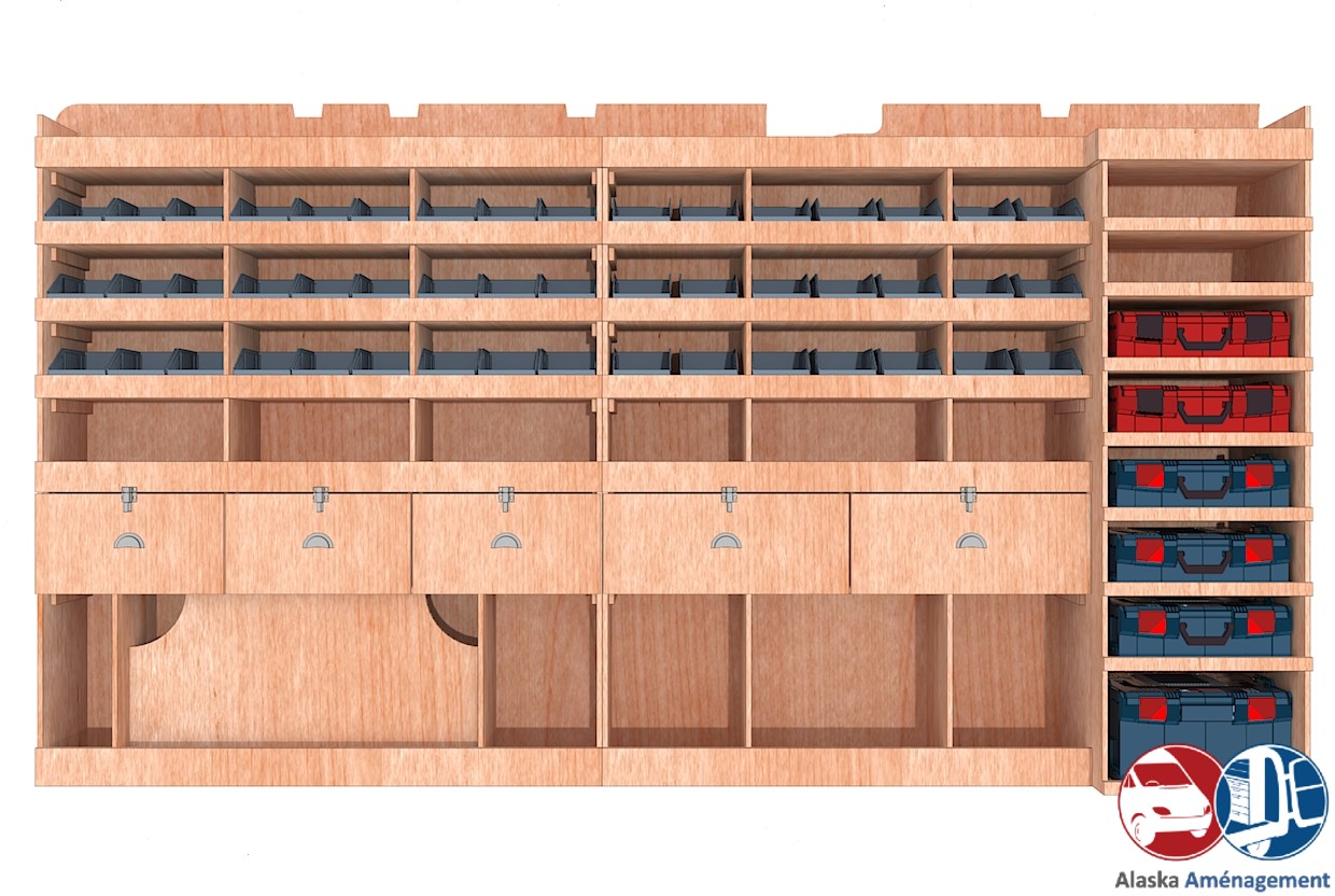 Ce meuble de rangement KRMG004-N (pour le latéral « Gauche » de votre véhicule) offre une solution polyvalente et fonctionnelle avec sept niveaux de stockage. Il comprend des étagères pour bacs à bec, une rangée de tiroirs et un module spécifique pour les mallettes d’électroportatif. Une étagère supérieure est conçue pour les objets longs. Son fond arrière intégré assure la rigidité et protège la carrosserie du véhicule, évitant un habillage supplémentaire. Le meuble est disponible en contreplaqué brut ou filmé. |