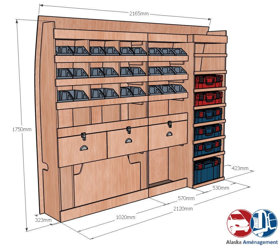 Ce meuble de rangement KRMG004-N (pour le latéral « Gauche » de votre véhicule) offre une solution polyvalente et fonctionnelle avec six niveaux de stockage. Il comprend des étagères pour bacs à bec, une rangée de tiroirs et un module spécifique pour les mallettes d’électroportatif. Une étagère supérieure est conçue pour les objets longs. Son fond arrière intégré assure la rigidité et protège la carrosserie du véhicule, évitant un habillage supplémentaire. Le meuble est disponible en contreplaqué brut ou filmé.