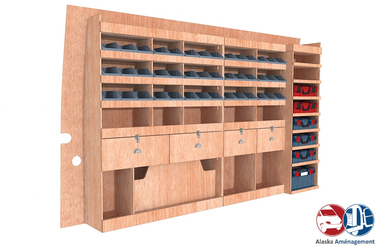 Ce meuble de rangement KRMG004-N(pour le latéral « Gauche » de votre véhicule) offre une solution polyvalente et fonctionnelle avec sept niveaux de stockage. Il comprend des étagères pour bacs à bec, une rangée de tiroirs et un module spécifique pour les mallettes d’électroportatif. Une étagère supérieure est conçue pour les objets longs. Son fond arrière intégré assure la rigidité et protège la carrosserie du véhicule, évitant un habillage supplémentaire. Le meuble est disponible en contreplaqué brut ou filmé.