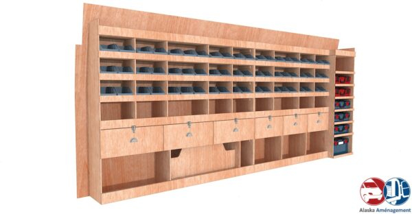 Ce meuble de rangement KRMG004-N (pour le latéral « Gauche » de votre véhicule) offre une solution polyvalente et fonctionnelle avec sept niveaux de stockage. Il comprend des étagères pour bacs à bec, une rangée de tiroirs et un module spécifique pour les mallettes d’électroportatif. Une étagère supérieure est conçue pour les objets longs. Son fond arrière intégré assure la rigidité et protège la carrosserie du véhicule, évitant un habillage supplémentaire. Le meuble est disponible en contreplaqué brut ou filmé. |
