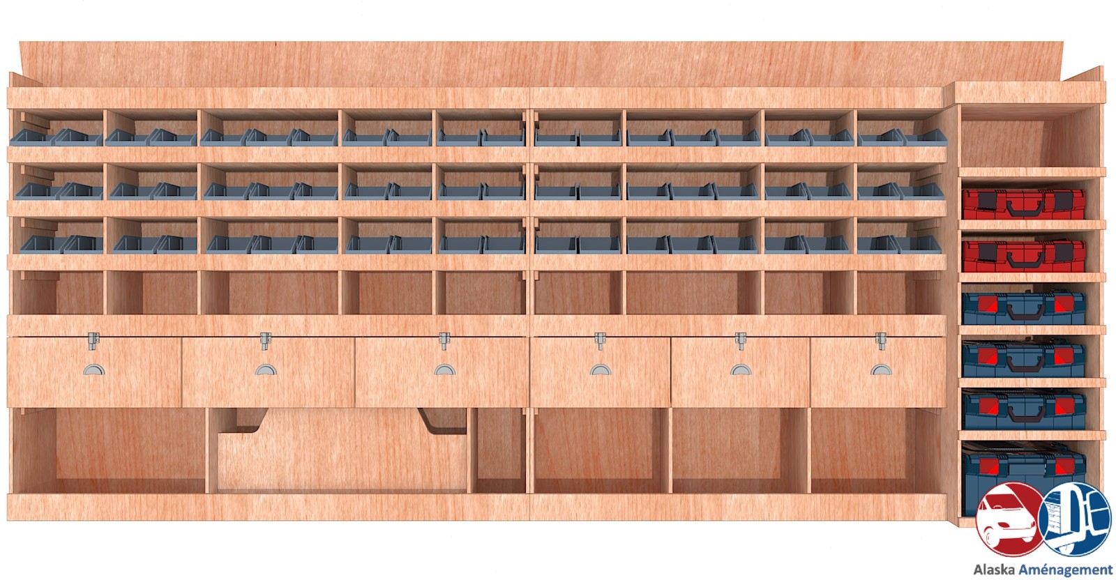 Ce meuble de rangement KRMG004-N (pour le latéral « Gauche » de votre véhicule) offre une solution polyvalente et fonctionnelle avec sept niveaux de stockage. Il comprend des étagères pour bacs à bec, une rangée de tiroirs et un module spécifique pour les mallettes d’électroportatif. Une étagère supérieure est conçue pour les objets longs. Son fond arrière intégré assure la rigidité et protège la carrosserie du véhicule, évitant un habillage supplémentaire. Le meuble est disponible en contreplaqué brut ou filmé.