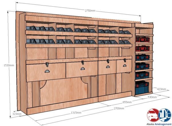 Ce meuble de rangement KRMG004-N (pour le latéral « Gauche » de votre véhicule) offre une solution polyvalente et fonctionnelle avec six niveaux de stockage. Il comprend des étagères pour bacs à bec, une rangée de tiroirs et un module spécifique pour les mallettes d’électroportatif. Une étagère supérieure est conçue pour les objets longs. Son fond arrière intégré assure la rigidité et protège la carrosserie du véhicule, évitant un habillage supplémentaire. Le meuble est disponible en contreplaqué brut ou filmé.