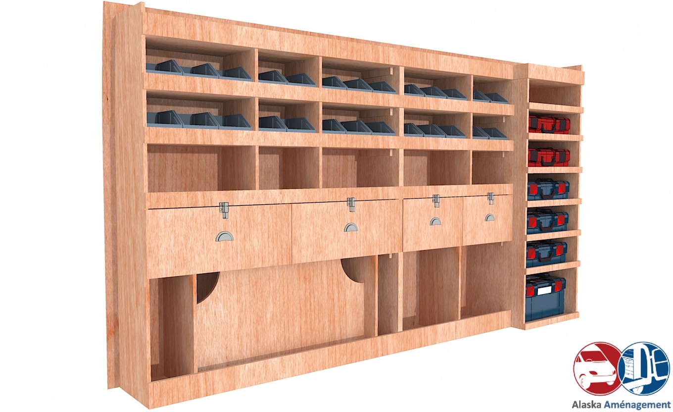 Ce meuble de rangement KRMG004-N (pour le latéral « Gauche » de votre véhicule) offre une solution polyvalente et fonctionnelle avec six niveaux de stockage. Il comprend des étagères pour bacs à bec, une rangée de tiroirs et un module spécifique pour les mallettes d’électroportatif. Une étagère supérieure est conçue pour les objets longs. Son fond arrière intégré assure la rigidité et protège la carrosserie du véhicule, évitant un habillage supplémentaire. Le meuble est disponible en contreplaqué brut ou filmé.
