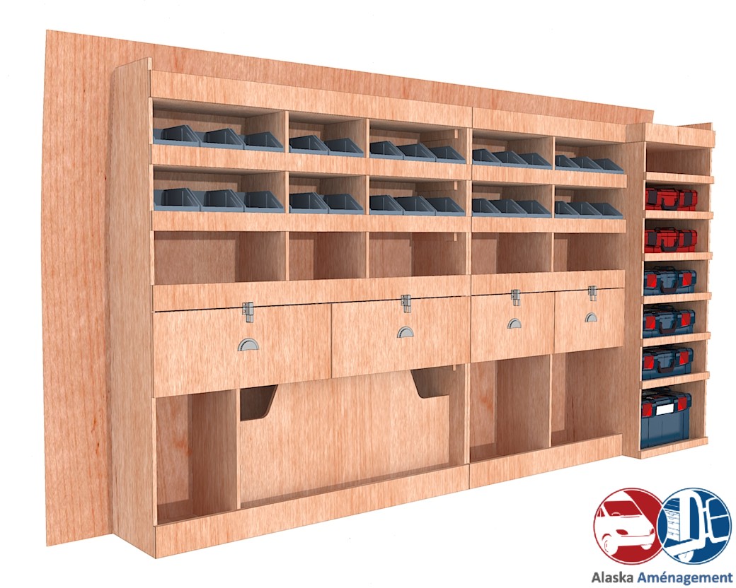 Ce meuble de rangement KRMG004-N(pour le latéral « Gauche » de votre véhicule) offre une solution polyvalente et fonctionnelle avec six niveaux de stockage. Il comprend des étagères pour bacs à bec, une rangée de tiroirs et un module spécifique pour les mallettes d’électroportatif. Une étagère supérieure est conçue pour les objets longs. Son fond arrière intégré assure la rigidité et protège la carrosserie du véhicule, évitant un habillage supplémentaire. Le meuble est disponible en contreplaqué brut ou filmé.