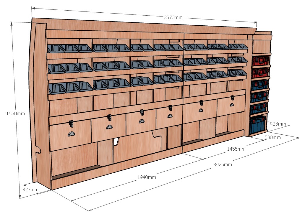 Ce meuble de rangement KRMG004-N (pour le latéral « Gauche » de votre véhicule) offre une solution polyvalente et fonctionnelle avec sept niveaux de stockage. Il comprend des étagères pour bacs à bec, une rangée de tiroirs et un module spécifique pour les mallettes d’électroportatif. Une étagère supérieure est conçue pour les objets longs. Son fond arrière intégré assure la rigidité et protège la carrosserie du véhicule, évitant un habillage supplémentaire. Le meuble est disponible en contreplaqué brut ou filmé. |
