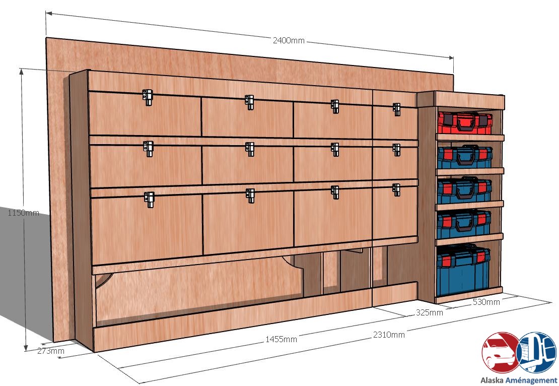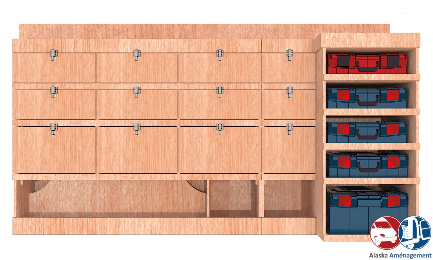 Ce meuble de rangement KRMG004-N (pour le latéral « Gauche » de votre véhicule) offre une solution polyvalente et fonctionnelle avec cinq niveaux de stockage. Il comprend des rangées de clapets et un module spécifique pour les mallettes d’électroportatif. Une étagère supérieure est conçue pour les objets longs. Son fond arrière intégré assure la rigidité et protège la carrosserie du véhicule, évitant un habillage supplémentaire. Le meuble est disponible en contreplaqué brut ou filmé. |