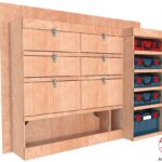 Ce meuble de rangement KRMG004-N (pour le latéral « Gauche » de votre véhicule) offre une solution polyvalente et fonctionnelle avec cinq niveaux de stockage. Il comprend des rangées de clapets et un module spécifique pour les mallettes d’électroportatif. Une étagère supérieure est conçue pour les objets longs. Son fond arrière intégré assure la rigidité et protège la carrosserie du véhicule, évitant un habillage supplémentaire. Le meuble est disponible en contreplaqué brut ou filmé.