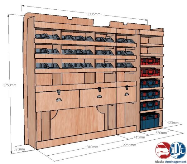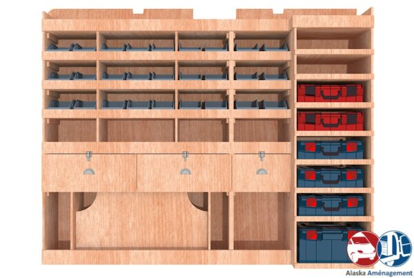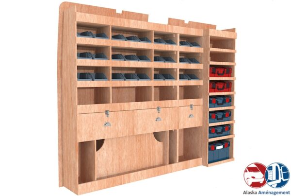 Ce meuble de rangement KRMG004-N(pour le latéral « Gauche » de votre véhicule) offre une solution polyvalente et fonctionnelle avec six niveaux de stockage. Il comprend des étagères pour bacs à bec, une rangée de tiroirs et un module spécifique pour les mallettes d’électroportatif. Une étagère supérieure est conçue pour les objets longs. Son fond arrière intégré assure la rigidité et protège la carrosserie du véhicule, évitant un habillage supplémentaire. Le meuble est disponible en contreplaqué brut ou filmé.