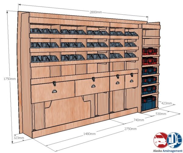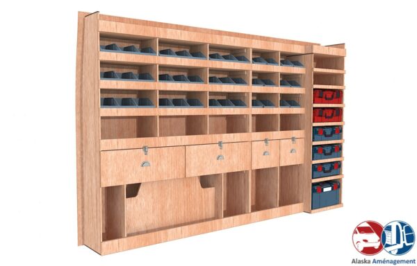 Ce meuble de rangement KRMG004-N(pour le latéral « Gauche » de votre véhicule) offre une solution polyvalente et fonctionnelle avec sept niveaux de stockage. Il comprend des étagères pour bacs à bec, une rangée de tiroirs et un module spécifique pour les mallettes d’électroportatif. Une étagère supérieure est conçue pour les objets longs. Son fond arrière intégré assure la rigidité et protège la carrosserie du véhicule, évitant un habillage supplémentaire. Le meuble est disponible en contreplaqué brut ou filmé.