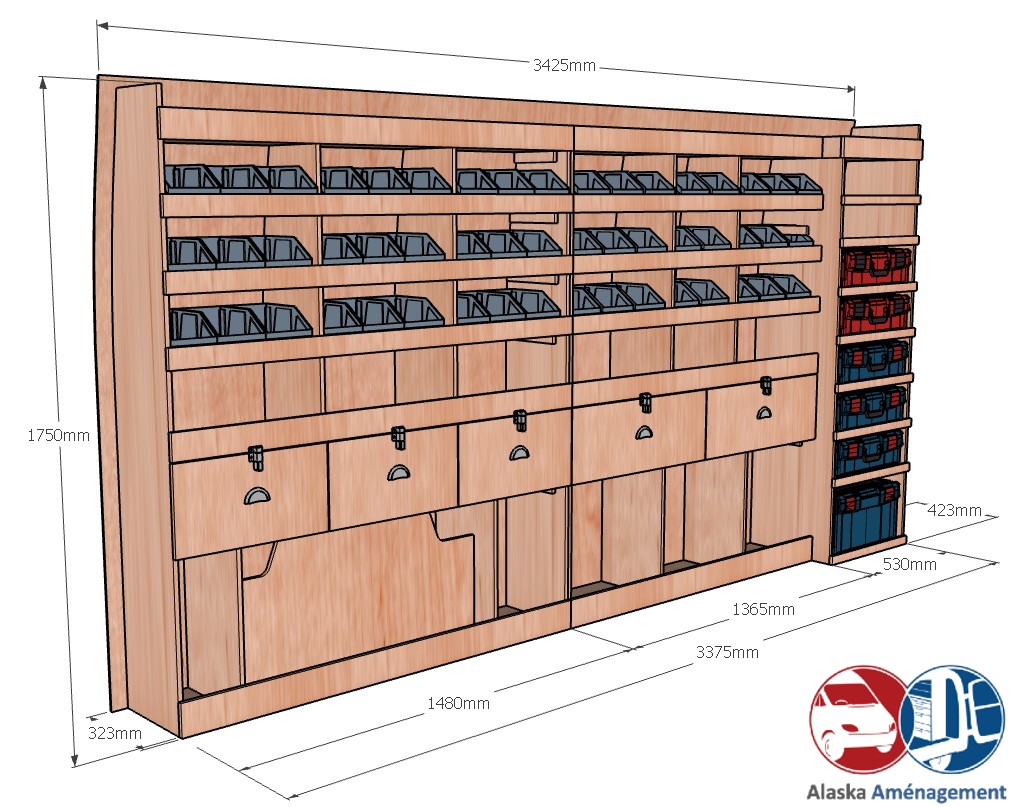 Ce meuble de rangement KRMG004-N (pour le latéral « Gauche » de votre véhicule) offre une solution polyvalente et fonctionnelle avec sept niveaux de stockage. Il comprend des étagères pour bacs à bec, une rangée de tiroirs et un module spécifique pour les mallettes d’électroportatif. Une étagère supérieure est conçue pour les objets longs. Son fond arrière intégré assure la rigidité et protège la carrosserie du véhicule, évitant un habillage supplémentaire. Le meuble est disponible en contreplaqué brut ou filmé.