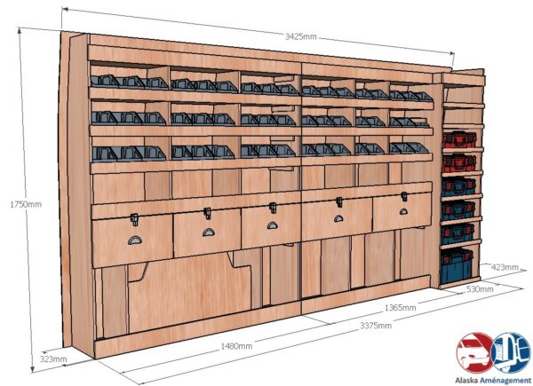 Ce meuble de rangement KRMG004-N(pour le latéral « Gauche » de votre véhicule) offre une solution polyvalente et fonctionnelle avec sept niveaux de stockage. Il comprend des étagères pour bacs à bec, une rangée de tiroirs et un module spécifique pour les mallettes d’électroportatif. Une étagère supérieure est conçue pour les objets longs. Son fond arrière intégré assure la rigidité et protège la carrosserie du véhicule, évitant un habillage supplémentaire. Le meuble est disponible en contreplaqué brut ou filmé.