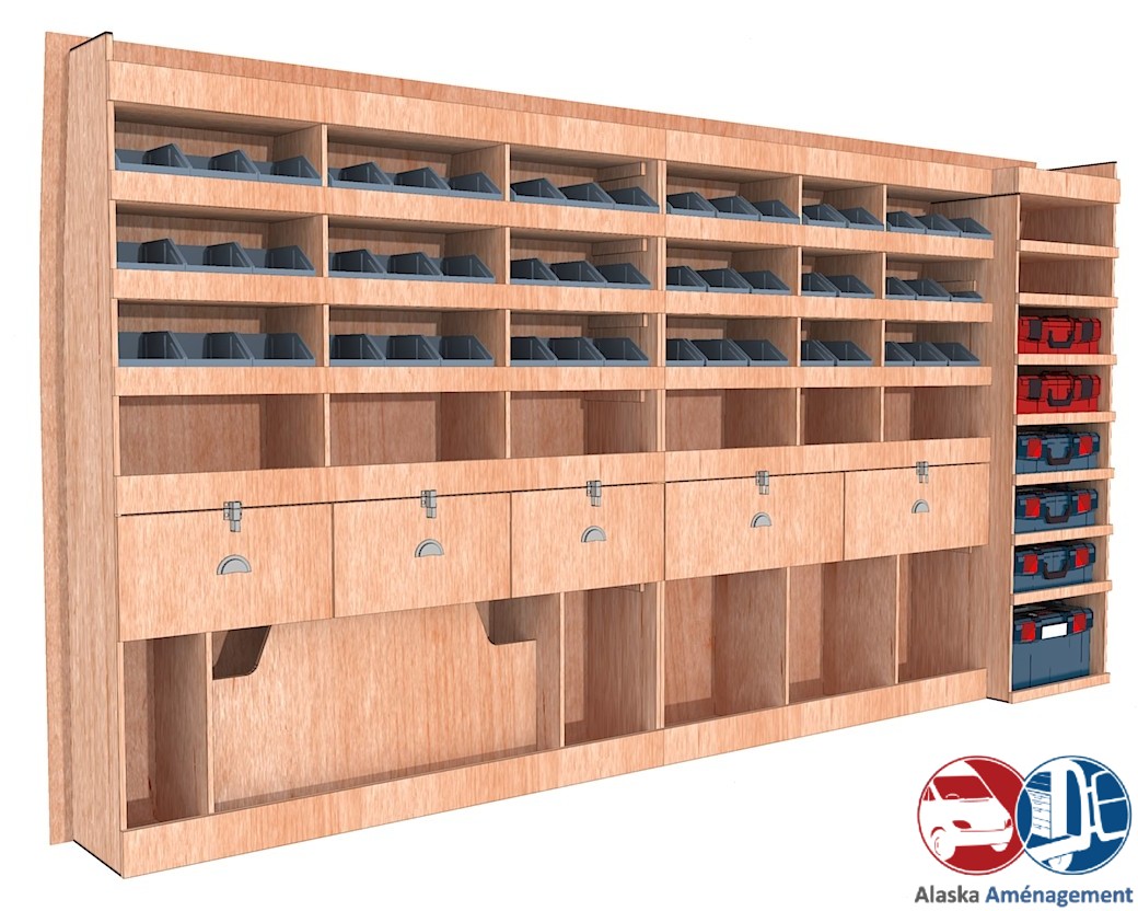 Ce meuble de rangement KRMG004-N(pour le latéral « Gauche » de votre véhicule) offre une solution polyvalente et fonctionnelle avec sept niveaux de stockage. Il comprend des étagères pour bacs à bec, une rangée de tiroirs et un module spécifique pour les mallettes d’électroportatif. Une étagère supérieure est conçue pour les objets longs. Son fond arrière intégré assure la rigidité et protège la carrosserie du véhicule, évitant un habillage supplémentaire. Le meuble est disponible en contreplaqué brut ou filmé.