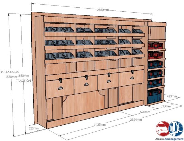 Ce meuble de rangement KRMG004-N(pour le latéral « Gauche » de votre véhicule) offre une solution polyvalente et fonctionnelle avec sept niveaux de stockage. Il comprend des étagères pour bacs à bec, une rangée de tiroirs et un module spécifique pour les mallettes d’électroportatif. Une étagère supérieure est conçue pour les objets longs. Son fond arrière intégré assure la rigidité et protège la carrosserie du véhicule, évitant un habillage supplémentaire. Le meuble est disponible en contreplaqué brut ou filmé.